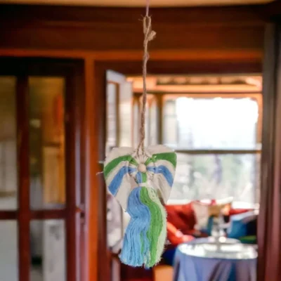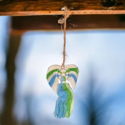 Aniołek Makrama – Ziemia. Wymiary 22 x 14 x 1 cm. Aniołek makrama to niezwykła ozdoba o unikalnym stylu. Tworzony jest w malowniczych, górskich regionach Indonezji z naturalnej, ekologicznej bawełny, która jest ręcznie pozyskiwana i tkana w rodzinnych warsztatach rzemieślniczych. Każdy egzemplarz stanowi niepowtarzalne rękodzieło, wykonywane z ogromną starannością i dbałością o najmniejsze detale. Do jego stworzenia stosuje się tradycyjne techniki makramy, takie jak węzeł kwadratowy czy charakterystyczny węzeł głowy skowronka. To właśnie on nadaje aniołkowi wyjątkową formę skrzydeł, sukni i całej postaci.