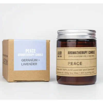 Aromaterapeutyczna świeczka sojowa – Spokój / Lawenda i bodziszek. Produkt stworzony z naturalnych składników, idealny do relaksu i aromaterapii. Zawiera 100% czyste olejki eteryczne z lawendy i bodziszka, dzięki czemu łagodzi napięcie, koi nerwy oraz wspomaga wyciszenie po długim dniu. Produkowana na bazie ekologicznego wosku sojowego; masa świecy wynosi 200 g, a czas palenia to aż 40 godzin. Bez sztucznych dodatków, bezpieczna dla zdrowia i środowiska, rekomendowana jako naturalny sposób na odświeżenie wnętrza i stworzenie spokojnej atmosfery.