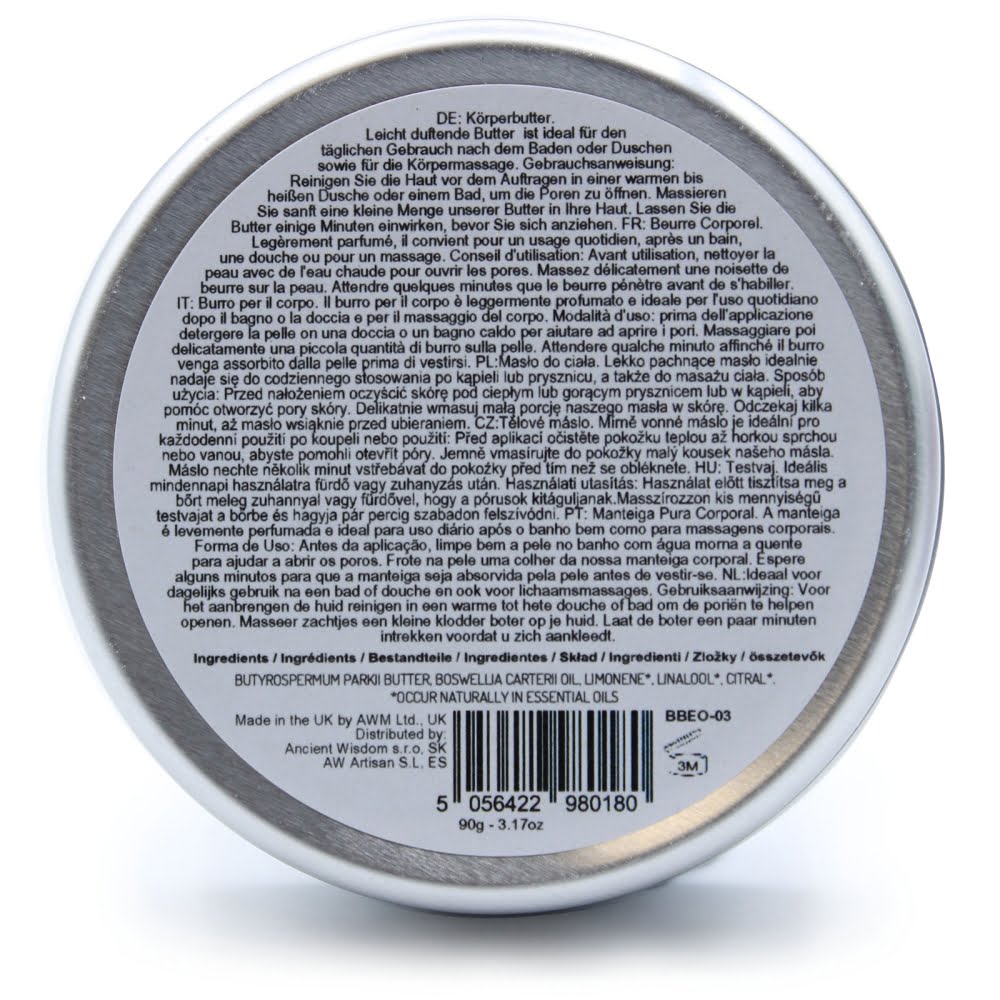 Aromaterapeutyczne masło Shea – Kadzidłowiec. Pojemność 90 g. Delikatnie pachnące masło jest idealne do codziennego stosowania po kąpieli, a także do masażu ciała. Jest produktem wegańskim zawierającym naturalne i czyste olejki zapachowe. Stężenie naturalnych witamin i kwasów tłuszczowych sprawia, że świetnie nawilża i odżywia skórę. Zapewnia zachowanie naturalnych olejków skóry. Wysoka zawartość tłuszczu sprawia, że masło shea jest doskonałym, naturalnym emolientem i humektantem, zatrzymującym wilgoć i utrzymującym nawilżenie skóry. Efekt? Zadbana i gładka skóra.