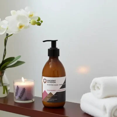 Balsam do rąk i ciała – Malina i Granat. Pojemność 300 ml. Nowy wegański kosmetyk od Ancient Wisdom – Perfumowany balsam do rąk i ciała. Stworzony z myślą o codziennej, kojącej pielęgnacji. Unikalna kompozycja owocowych składników intensywnie nawilża oraz koi skórę, pozostawiając ją aksamitną i miękką w dotyku a także przyjemnie pachnącą.