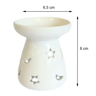 Biały kominek zapachowy – Gwiazdki. Wysokość 8 cm. Ceramiczny kominek do aromaterapii w klasycznej bieli, wyróżniający się wycięciami w kształcie gwiazdek i półksiężyców. Starannie wykonany, pozwala na efektowną grę światła, która tworzy unikalny, przytulny nastrój w każdym wnętrzu. Idealny do rozprowadzania zapachu ulubionych olejków lub wosków — w salonie, sypialni czy łazience zadba o relaksującą atmosferę i stanie się oryginalną ozdobą domu.