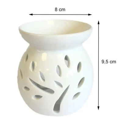 Biały kominek zapachowy – Tree. Wysokość 9,5 cm. Elegancki, ceramiczny kominek do aromaterapii w klasycznej bieli, ozdobiony ażurowym wzorem liści. Dzięki starannemu wykonaniu i dekoracyjnym wycięciom kominek nie tylko rozprowadza ulubione zapachy olejków lub wosków, ale również tworzy nastrojowe efekty świetlne. Doskonale sprawdzi się w salonie, sypialni czy łazience — wprowadzi relaksującą atmosferę a dodatkowo stanie się unikatową ozdobą każdego wnętrza.