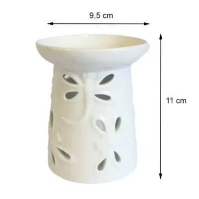 Biały kominek zapachowy – Ważki. Wysokość 11 cm. Elegancki, ceramiczny kominek do aromaterapii w klasycznej bieli, ozdobiony dekoracyjnym motywem ważek. Starannie wykonany, z ażurowymi wycięciami, które nie tylko rozprowadzają aromat ulubionych olejków lub wosków, ale także tworzą nastrojowe efekty świetlne. Doskonale sprawdzi się w salonie, sypialni czy łazience — zadba o relaksującą atmosferę a także będzie unikatową ozdobą każdego wnętrza.