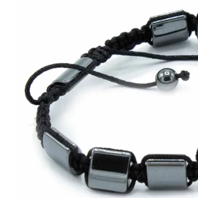 Bransoletka magnetyczna z Hematytu – Prostopadłościany. Wymiary 7 x 0,5 cm. Bransoletka magnetyczna z prostopadłościennych koralików hematytu inspirowana jest tybetańską tradycją Shamballa, która od wieków symbolizuje spokój, miłość i duchowe oświecenie. Tworzą ją naturalnie magnetyczne prostopadłościany hematytu, cenione za właściwości uziemiające, równoważące emocje oraz wspierające dobre samopoczucie. Hematyt działa ochronnie, pomaga ustabilizować nastrój i wzmacniać wewnętrzną harmonię oraz siłę.