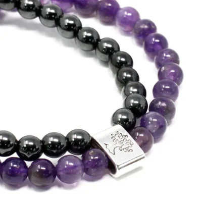 Bransoletka magnetyczna z kamieniami – Ametyst. Wymiary 10 x 4 x 3 cm. Dwie elastyczne bransoletki — jedna wykonana z kamieni naturalnych, druga z magnetycznych koralików. Połączone elegancką, srebrną spinką, tworzą unikalny i ponadczasowy komplet. Takie bransoletki pełnią nie tylko funkcję ozdobną, ale też bywają używane w terapii magnetycznej, opartej na działaniu stałego pola magnetycznego na organizm. Zazwyczaj ma to efekt profilaktyczny i wspomagający zdrowie.