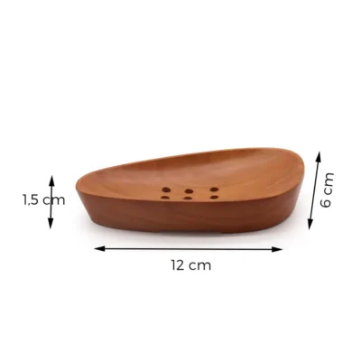Drewniana mydelniczka – Trójkątna. Wymiary 12 x 6 cm. Drewniana mydelniczka z pigwicy właściwej zachwyca nowoczesną formą i naturalnym pięknem materiału. Jej asymetryczny, lekko zaokrąglony kształt z subtelnym wyprofilowaniem sprawia, że mydło pozostaje na miejscu. Sześć precyzyjnie rozmieszczonych otworów skutecznie odprowadza wodę, chroniąc je przed rozmiękczeniem. Ciepły, miodowy odcień drewna z delikatnie zarysowanymi słojami dodaje łazience przytulności i stylu. To idealne połączenie funkcjonalności i estetyki, które doskonale wpisze się zarówno w nowoczesne, jak i klasyczne wnętrza.