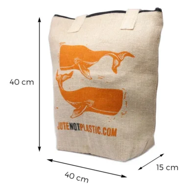Ekologiczna torba z juty – Whales. Wymiary 40 x 40 x 15 cm. Zamiast sięgać po jednorazowe, plastikowe torby, wybierz styl i troskę o środowisko. Torba z juty z motywem pomarańczowych i czarnych wielorybów i napisem „JUTE NOT PLASTIC.COM” to doskonała alternatywa dla plastiku – nie tylko przyciąga wzrok, lecz także jest świadomym wyborem. Wykonana z naturalnych włókien juty, jest biodegradowalna, trwała, a co ważniejsze, przeznaczona do wielokrotnego użytku.