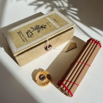 Kadzidełko Himalajskie – Drzewo Sandałowe. Wymiary opakowania 12 x 6,5 x 3,5 cm. Zestaw obejmuje 30 pachnących kadzidełek, stylową drewnianą podstawkę oraz ulotkę z informacjami. Wszystko umieszczone jest w dekoracyjnym pudełku, doskonałym na upominek. Każdy patyczek został wykonany ręcznie, zgodnie z tradycyjnymi recepturami nepalskich rzemieślników, z użyciem najwyższej jakości naturalnych składników.