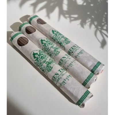 Kadzidło tybetańskie – Zielona Tara. Wymiary opakowania 20 x 3 cm. Opakowanie zawiera 30 sztuk kadzideł o długości 20 cm. Starannie wyselekcjonowane kadzidła tybetańskie to nie tylko produkt, ale zaproszenie do duchowej podróży w mistyczne Himalaje. Tworzone ręcznie z najwyższej jakości naturalnych składników, łączą autentyczne doświadczenie z bogatym dziedzictwem kulturowym Tybetu. Doskonale sprawdzą się podczas medytacji, jogi, modlitwy czy chwil odpoczynku po długim dniu. Stworzą nastrojową atmosferę sprzyjającą wyciszeniu, duchowej koncentracji a także głębszej introspekcji.