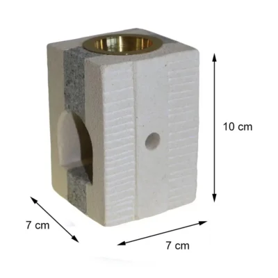 Kamienny kominek zapachowy – Square. Wymiary 7x7x10 cm. Powstał dzięki doświadczeniu lokalnych twórców z indonezyjskiej Jawy, którzy od pokoleń doskonalą sztukę pracy z naturalnym kamieniem. Bryła kominka przyciąga uwagę prostokątnym, geometrycznym kształtem oraz kontrastowym zestawieniem dwóch rodzajów kamienia – jasnego piaskowca i szarego granitu. Otwory rozmieszczone na powierzchni nie tylko nadają kominkowi nowoczesny, dynamiczny wygląd, ale także wspomagają obieg powietrza, intensyfikując rozprzestrzenianie się aromatu w pomieszczeniu. Wyjmowana mosiężna miseczka pozwala na stosowanie różnorodnych zapachów – od olejków aromatycznych, przez woski zapachowe, aż po pachnące granulki.