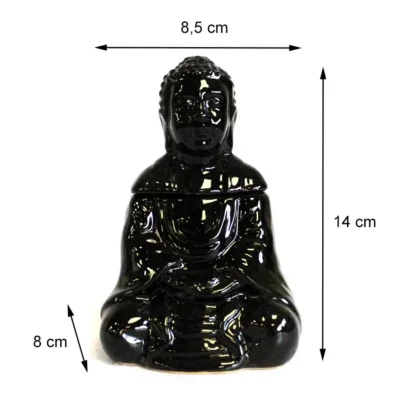 Kominek zapachowy Budda – Czarny. Wysokość 14 cm. Elegancki kominek ceramiczny, wykonany w kształcie siedzącego Buddy, to wyjątkowa dekoracja, która wprowadzi harmonię i atmosferę odprężenia do każdego wnętrza. Głęboka, czarna barwa nadaje mu klasy oraz szlachetności, świetnie komponując się zarówno z nowoczesnym, jak i klasycznym wystrojem. Całość składa się z dwóch części – pojemnika na świeczkę oraz stylowej pokrywki – co zapewnia funkcjonalność i wygodę użytkowania.