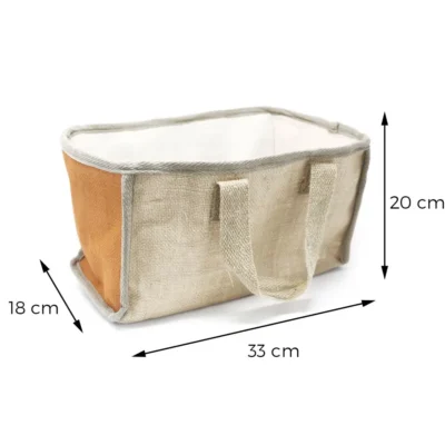 Koszyk na zakupy z juty – Kurkuma Duży. Wymiary 33 x 18 x 20 cm. Stylowy, kompaktowy koszyk na zakupy w naturalnym odcieniu to połączenie prostoty i elegancji z subtelnym pomarańczowym akcentem po bokach. Szerokie, solidne uchwyty zapewniają wygodny chwyt, a wytrzymała juta najwyższej jakości gwarantuje długie użytkowanie. Lekki i poręczny – idealny na szybkie zakupy, wizytę na bazarku czy jako modny organizer w domu. To z pewnością ekologiczny wybór dla świadomych klientów, którzy stawiają na funkcjonalność i styl.