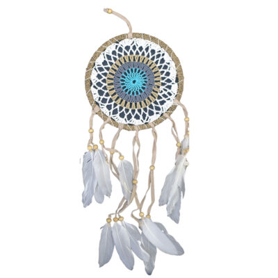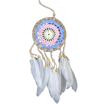 Unikatowe łapacze snów mają okrągłą ramę, starannie oplecioną naturalnym sznurkiem, co nadaje im rustykalny charakter. Wewnątrz ramy umieszczono ręcznie robioną koronkę w pastelowych odcieniach różu, błękitu i kremowej bieli, tworząc kojący dla oka wzór. Lekkie, białe piórka, zawieszone na sznurkach z drewnianymi koralikami, delikatnie kołyszą się, zapewniając spokojny sen. Idealne do pokoju dziecięcego, sypialni lub jako etniczny akcent w każdym wnętrzu. Wybierz swój wymarzony łapacz snów i otocz się pozytywną energią!