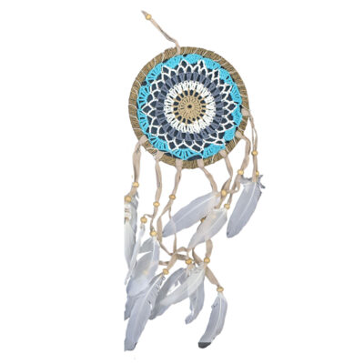 Każdy łapacz snów charakteryzuje się okrągłą ramą, starannie oplecioną naturalnym sznurkiem, co nadaje mu ciepły, rustykalny wygląd. Wewnątrz ramy znajduje się delikatna, ręcznie robiona koronka. Pastelowe odcienie różu, błękitu i kremowej bieli tworzą kojący, subtelny wzór. Delikatne, białe piórka, przymocowane do sznurków z naturalnymi, drewnianymi koralikami, subtelnie poruszają się, dodając uroku i zapewniając spokojny sen. Idealne do pokoju dziecka, sypialni, a także jako etniczny, delikatny akcent w każdym pomieszczeniu.