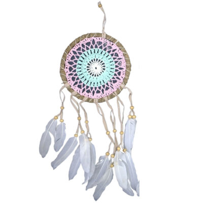 Każdy łapacz snów, to unikatowe dzieło sztuki. Okrągła rama opleciona jest naturalnym sznurkiem, co dodaje im rustykalnego uroku. Wewnątrz ramy znajduje się delikatna, ręcznie robiona koronka w pastelowych odcieniach różu, błękitu i zieleni, tworząc subtelny i kojący wzór. Wiszące z łapacza snów lekkie piórka, przymocowane za pomocą drewnianych koralików, delikatnie kołyszą się na wietrze, przynosząc błogi sen. Pastelowa kolorystyka sprawia, że idealnie wpasuje się do pokoju dziecięcego, sypialni, czy wnętrza, któremu chcesz dodać etnicznego uroku. Pozwól, aby nasze łapacze snów wprowadziły do Twojego domu harmonię i pozytywną energię.