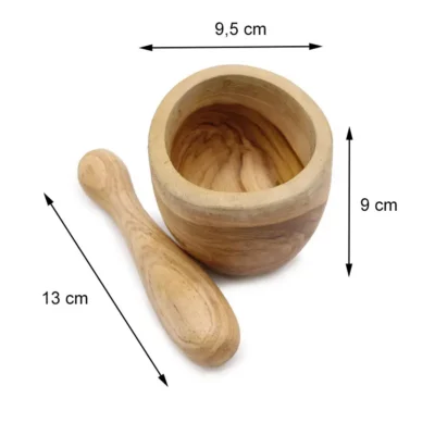 Moździerz z drewna tekowego – Mały. Wymiary: 9,5 x 9 cm, tłuczek 13 cm. Moździerz z drewna tekowego to elegancki i trwały dodatek do każdej kuchni, który łączy w sobie walory użytkowe z naturalną estetyką. Wykonany z twardego, odpornego na wilgoć i szkodniki drewna tekowego, znakomicie sprawdza się do rozdrabniania ziół, przypraw czy nasion, wydobywając ich pełen aromat i smak.