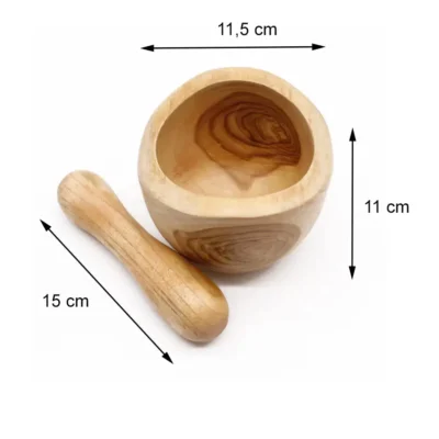 Moździerz z drewna tekowego – Średni. Wymiary: 11 x 11,5 cm, tłuczek 15 cm. Moździerz z drewna tekowego to stylowy i solidny element kuchni, który łączy funkcjonalność z naturalnym pięknem. Wykonany z wytrzymałego, odpornego na wilgoć i uszkodzenia drewna, świetnie nadaje się do ucierania ziół, przypraw i nasion, wydobywając ich intensywny smak i aromat.
