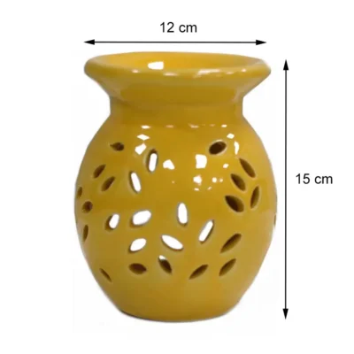 Pomarańczowy kominek zapachowy. Wymiary: 15 x 12 cm. Elegancki, ceramiczny kominek do aromaterapii w ciepłym pomarańczowym kolorze, ozdobiony ażurowym wzorem liści. Idealnie łączy walory dekoracyjne z praktycznym zastosowaniem – rozprowadza zapach ulubionych olejków lub wosków, jednocześnie tworząc przyjemną, nastrojową poświatę. Wprowadzi do wnętrza energię i harmonię, sprawdzając się w salonie, sypialni czy łazience jako wyjątkowa i funkcjonalna ozdoba.
