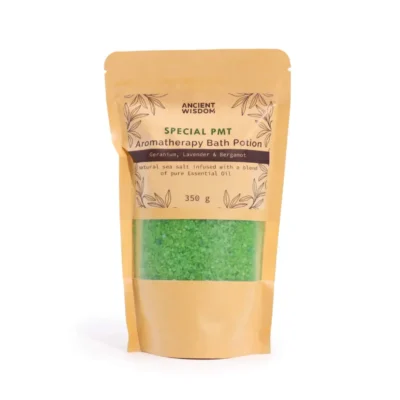 Sól do kąpieli – PMT- Geranium, Lawenda i Bergamotka. Kosmetyk ten to aromaterapeutyczna kompozycja naturalnej soli morskiej z dodatkiem czystych olejków eterycznych z geranium, lawendy i bergamotki. Starannie dobrane składniki wspierają równowagę ciała i umysłu, pomagając ukoić napięcie oraz poprawić nastrój. To delikatna, odprężająca kąpiel stworzona z myślą o szczególnej pielęgnacji w wymagających dniach cyklu.