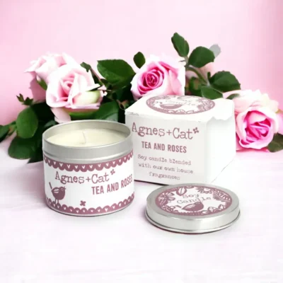 Świeca w puszce – Tea and Roses. Wymiary 7,5 x 6 cm. Tea and Roses to sojowa świeca łącząca delikatność płatków róż z subtelną świeżością liści herbaty i cytrusów. Jej zapach przywodzi na myśl angielski ogród. Pełen kwitnących róż, przełamany orzeźwiającą nutą czarnej herbaty, odrobiną białej ambry oraz odświeżającymi akcentami lawendy i jaśminu. To kompozycja idealna zarówno na romantyczny wieczór, jak i codzienny relaks, a ekologiczne opakowanie i designerska puszka podkreślają wyjątkowy charakter tej świecy.