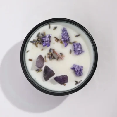 - Kamienie: W świecy zatopiono ametyst, który pomaga osiągnąć wewnętrzną równowagę, uspokojenie i klarowność umysłu. Jego działanie redukuje stres, sprzyja relaksowi i pogłębia koncentrację podczas medytacji. Lawendowy zapach jest świeży, kwiatowy i lekko ziołowy, wycisza oraz tworzy w przestrzeni atmosferę naturalnej czystości, delikatnie otulając zmysły.