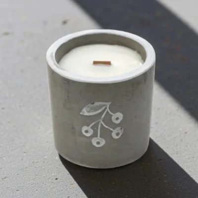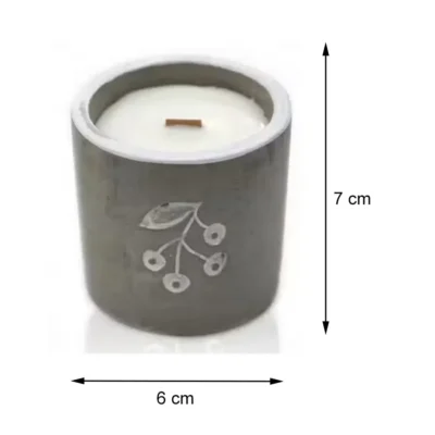 Świeczka w betonie – Jałowiec. Wymiary 7 x 6 cm. Świeca sojowa o aromacie jałowca i słodkiego ginu stanowi ekologiczną alternatywę dla klasycznych świec parafinowych. Wytwarzana jest z naturalnego wosku roślinnego, pozbawionego parafiny i sztucznych dodatków. Pali się równomiernie, dzięki czemu nie osadza się na ściankach pojemnika, a jej zapach wypełnia wnętrze intensywniej i na dłużej.