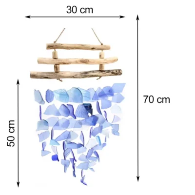 Szklany Dzwonek Wietrzny – Blue. Wymiary 30 x 70 cm. Dzwonek wietrzny wykonany z jasnoniebieskiego szkła, zawieszony na efektownej konstrukcji z naturalnych, drewnianych szczebelków. Liczne szklane fragmenty tworzą nieregularny, lekko kaskadowy układ, który pięknie prezentuje się na tle światła i wydaje subtelne dźwięki poruszane wiatrem. Dekoracja idealna do ogrodu, na balkon lub do wnętrz — wprowadza świeżość, kolor oraz oryginalny charakter do otoczenia.
