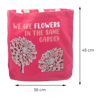 Minimalistyczny nadruk „We are flowers in the same garden” nadaje torbie wyjątkowego charakteru i podkreśla jej ekologiczny styl. Dopełnieniem całości są subtelne ilustracje różowych kwiatów, które wprowadzają delikatny, kobiecy akcent i przyciągają spojrzenia swoją lekkością.