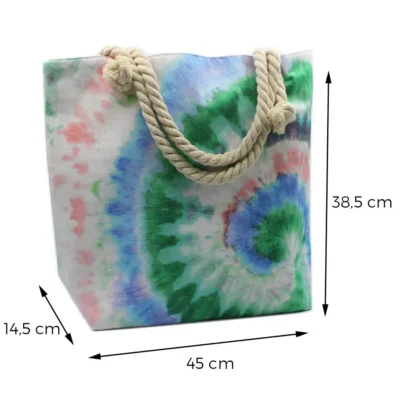Torba Tęczowa – Nature Vibe. Wymiary 45 x 14,5 x 38,5 cm. Torba z energetycznym, tie-dye wzorem w odcieniach zieleni, niebieskiego i różu od razu przywołuje na myśl beztroskę wakacji, letnich festiwali czy wypraw nad morze. Jej żywe kolory sprawią, że wyróżnisz się z tłumu i poczujesz wakacyjny klimat każdego dnia. Duża pojemność pozwoli zabrać wszystko, czego potrzebujesz na plażę, zakupy czy wycieczkę. Torba posiada wygodne, grube sznurkowe uchwyty na ramię, wewnętrzną małą kieszonkę na drobiazgi oraz praktyczne zapięcie na zamek, dzięki czemu Twoje rzeczy będą w pełni bezpieczne.