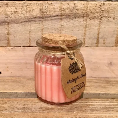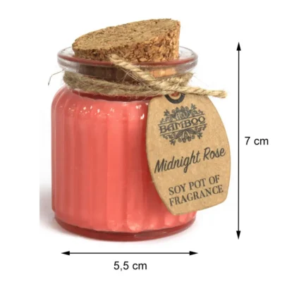 Zapachowa świeczka sojowa – Róża. Wymiary 7 x 5,5 x 5,5 cm. Wyjątkowy zapach różanego ogrodu zamknięty w świeczce wykonanej w 100% z naturalnego wosku sojowego oraz wyrafinowanej kompozycji olejków eterycznych i perfumeryjnych. Ryflowany szklany słoiczek z ekologicznym korkiem nie tylko podkreśla elegancję produktu, ale także skutecznie chroni jego zapach po zgaszeniu płomienia. Kwiatowe nuty świeżej róży wypełniają wnętrze atmosferą romantyzmu, przyjemności i wyciszenia, sprawdzając się doskonale podczas wieczornego relaksu lub pielęgnacyjnych rytuałów.