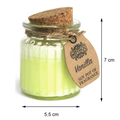 Zapachowa świeczka sojowa – Wanilia. Wymiary 7 x 5,5 x 5,5 cm. Odkryj kojący aromat wanilii zamkniętej w eleganckiej, sojowej świecy, której zapach powstał z naturalnych olejków eterycznych i kompozycji zapachowych najwyższej jakości. Stylowy, ryflowany słoiczek z ekologicznym korkiem podkreśla subtelność produktu i doskonale chroni słodką, kremową woń. Waniliowe nuty wypełniają wnętrze ciepłem, przyjemnością i relaksem. Wprowadzą atmosferę spokoju podczas wieczornego odpoczynku, rodzinnych spotkań czy chwil aromaterapii po intensywnym dniu.