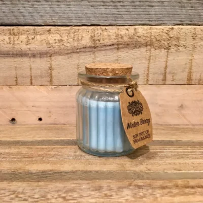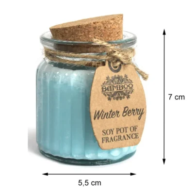 Zapachowa świeczka sojowa – Zimowa Jagoda. Wymiary 7 x 5,5 x 5,5 cm. Świeczka zapachowa to elegancki produkt wykonany w 100% z naturalnego wosku sojowego i pięknych aromatów stworzonych z mieszanki naturalnych olejków eterycznych i wysokiej jakości olejków perfumeryjnych. Całość umieszczono w stylowym, ryflowanym szklanym słoiczku. Zamknięcie z ekologicznego korka zapobiega utracie zapachu podczas gdy się nie pali. Delikatny, owocowy aromat zimowych jagód tworzy we wnętrzu przytulną, ciepłą atmosferę, wprowadzając nutę relaksu i odprężenia. Znakomicie sprawdza się podczas wieczornego odpoczynku lub chwili wyciszenia w zimowe dni.